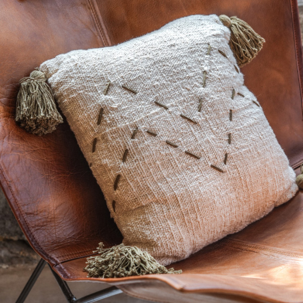 Découvrez notre élégante housse de coussin au design unique, ornée de pompons verts kaki aux extrémités et d’un motif géométrique au milieu. Cette création artisanale apportera une touche moderne et bohème à votre intérieur. La combinaison subtile des couleurs et des détails soignés ajoute une note de sophistication à votre décoration. Transformez votre espace en un lieu accueillant et tendance en commandant dès maintenant cette housse de coussin exceptionnelle sur notre boutique en ligne.